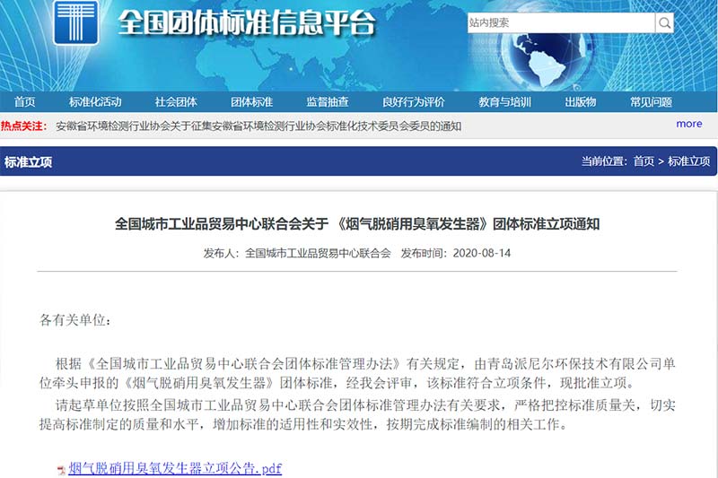全國城市工業(yè)品貿(mào)易中心聯(lián)合會關(guān)于《煙氣脫硝用臭氧發(fā)生器》團體標準立項通知